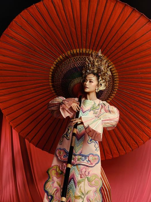 BST “Ru – Hò xự xang xê cống” của NTK Thủy Nguyễn chính là điểm nhấn nghệ thuật trong bộ ảnh này. Mỗi thiết kế là một câu chuyện về bản sắc dân tộc, được kể bằng ngôn ngữ của thời trang hiện đại. Những chất liệu quen thuộc như cotton, voan, vải xếp ly kết hợp cùng kỹ thuật đính kết khảm xà cừ, tạo nên hiệu ứng lấp lánh, tái hiện không khí sân khấu cải lương rực rỡ, nơi những câu chuyện nhân văn được truyền tải qua từng giai điệu, từng lớp lang trang phục. Bộ sưu tập không chỉ tôn vinh vẻ đẹp của thời trang mà còn gợi lên sự uy nghiêm và xa hoa của sân khấu cải lương qua những bộ áo choàng rộng, kết hợp cùng bờm, mão, phụ kiện cài tóc lộng lẫy. Cấu trúc đối xứng đầy nghệ thuật càng làm nổi bật tinh thần hoài niệm nhưng vẫn phóng khoáng, đậm chất đương đại.