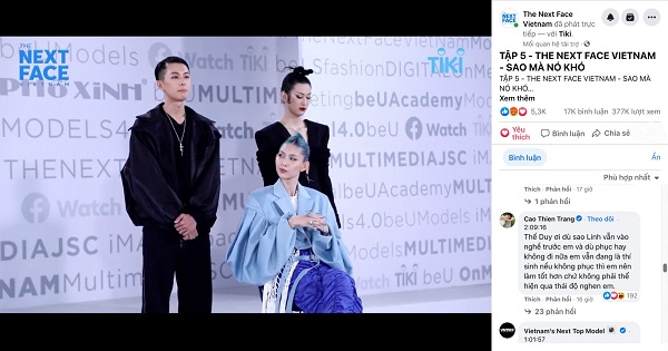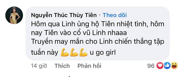 Bên cạnh lượt người xem trực tuyến vô cùng đông đảo thì điều đáng chú ý hơn cả chính là sự “đổ bộ” đầy bất ngờ của nhiều cái tên đình đám trong showbiz Việt “kéo” vào xem livestream công chiếu tập 5. Trong số đó phải kể đến những bình luận cực ‘cute’ đến từ nàng hậu đang làm “dậy sóng” truyền thông – Miss Grand International 2021 Nguyễn Thúc Thùy Tiên. Dù đang rất bận bịu vì vừa mới chính thức đăng quang trước đó không lâu nhưng cô vẫn dành thời gian vào ủng hộ người em thân thiết của mình là Mentor Lương Thùy Linh và để lại bình luận: “Hôm qua Linh ủng hộ Tiên nhiệt tình, hôm nay Tiên vào cỗ vũ Linh nha. Truyền may mắn cho Linh chiến thắng tập tuần này. You go girl (Tiến lên nhé cô gái)” và “Tiên đi giao lưu Báo xíu vào ủng hộ The Next Face tiếp nha”. Thành viên “Team Sang” – Cao Thiên Trang cũng rất quan tâm, ủng hộ chương trình năm nay. Cô là một trong những “fan cứng” của The Next Face Vietnam khi đã theo dõi rất kỹ tập phát sóng và để lại bình luận góp ý đến thí sinh team TyhD với cương vị của một đàn chị đi trước: “Thế Duy ơi, dù sao Linh vẫn vào nghề trước em và dù phục hay không đi nữa em vẫn đang là thí sinh. Nếu không phục thì em nên làm tốt hơn chứ không phải thể hiện qua thái độ nghen em”. Không chỉ dừng lại ở livestream công chiếu tập 5, Hoa hậu Thùy Tiên và người mẫu Cao Thiên Trang cũng thường xuyên theo dõi và để lại bình luận ở những tập phát sóng trước.