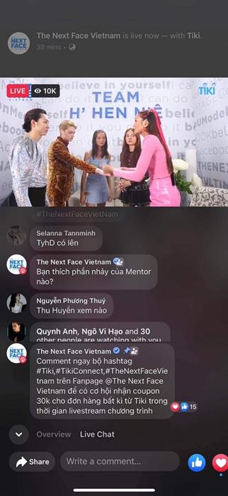 Đặc biệt, thông qua công cụ Messenger Bot do Facebook lần đầu tiên triển khai tại Việt Nam, khán giả theo dõi và tương tác trực tiếp trên Fanpage trong thời gian livestream với bộ hashtag #Tiki, #TikiConnect, #TheNextFaceVietnam, và tham gia dự đoán Quán quân sau mỗi tập bằng cách bình luận chữ ‘Bình chọn’ trên các bài biết của chương trình, cũng sẽ có cơ hội nhận coupon mua sắm hấp dẫn đến từ nhà tài trợ Tiki cho đơn hàng bất kỳ.