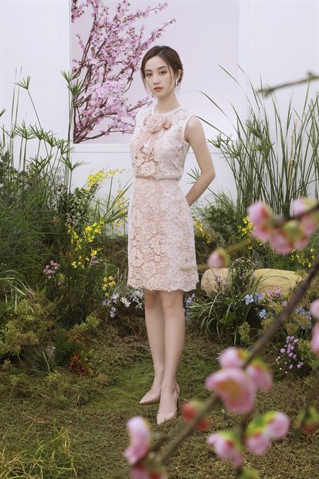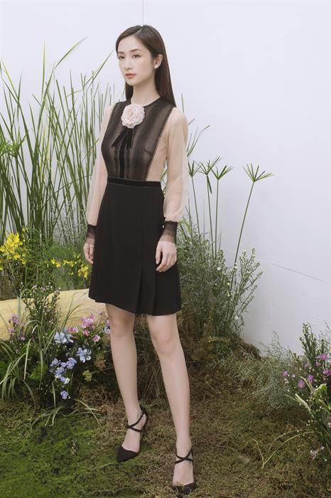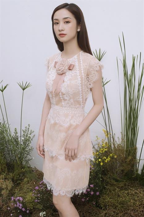 Điểm nhấn của bộ trang phục này là họa tiết ren được đính kết khéo léo thành hình trái tim cùng bông hồng giữa ngực áo giúp nữ diễn viên thêm phần tự tin khi đi làm hoặc dạo phố. Đây còn là những mẫu thiết kế hoàn hảo cho cuộc hẹn hò đầu tiên. Vẫn màu sắc tương tự như những bộ cánh trước, nhưng phần chân váy được sử dụng chất liệu ren lưới với thiết kế xòe tạo sự bồng bềnh khi di chuyển. Chiếc váy này giúp các nàng nổi bật trong những chuyến du lịch hay khi đi dạo phố.