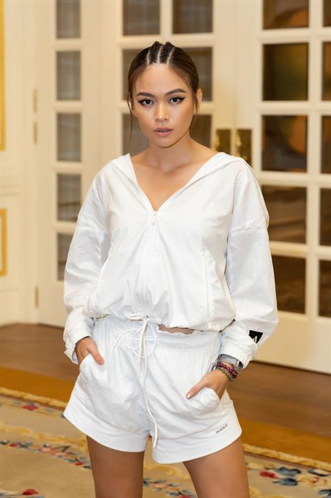 Với nhiều kinh nghiệm trong làng người mẫu, Á hậu Mâu Thủy cũng gây ấn tượng với trang phục có tông màu trắng trẻ trung, với gương mặt rạng rỡ. Với thần thái này, Mâu Thủy hứa hẹn sẽ tiếp tục “càn quét” sàn runway trong show diễn của NTK Hoàng Hải.