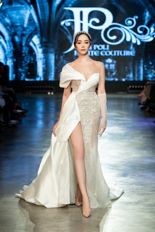 Tấm lụa trắng được NTK Phạm Đăng Anh Thư “chơi đùa” bằng cách gấp nếp ngẫu hứng, thêu chỉ kim tuyến hay phối cùng với chất liệu voan sheer, tạo nên một tổng thể vừa gợi cảm vừa kín đáo.