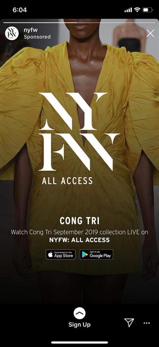 Không quá khó để thấy trong đoạn phim quảng cáo Tuần lễ Thời trang New York (NYFW) có xuất hiện của mẫu đầm ngắn màu vàng với cánh tay phồng của nhà mẫu CONG TRI. Đây được chọn là một trong những thiết kế xuất hiện nhằm giới thiệu NYFW, một trong bộ tứ bốn sự kiện thời trang đình đám trên thế giới.