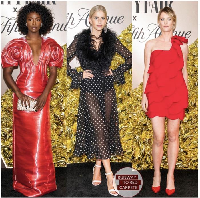 Jusitne Skye (ngoài cùng bên trái) diện mẫu đầm màu đỏ ấn tượng với phần ngực xẻ sâu, tay phồng cách điệu gợi liên tưởng đến những bông hoa hồng, phối cùng trang sức màu bạc và clutch ánh kim sáng màu