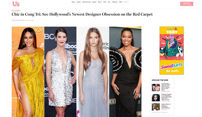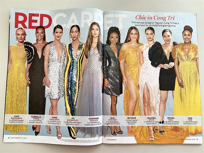 Nhưng chơi lớn nhất có lẽ là USMagazine khi chỉ mới vài giờ đồng hồ, trang báo đăng tải bài tổng hợp các thiết kế runway Thu Đông 2019 của Công Trí được nghệ sĩ quốc tế lựa chọn. Tác giả của bài báo đã ưu ái gọi Công Trí là “Nhà thiết kế mới gây nghiện trên Thảm Đỏ”.