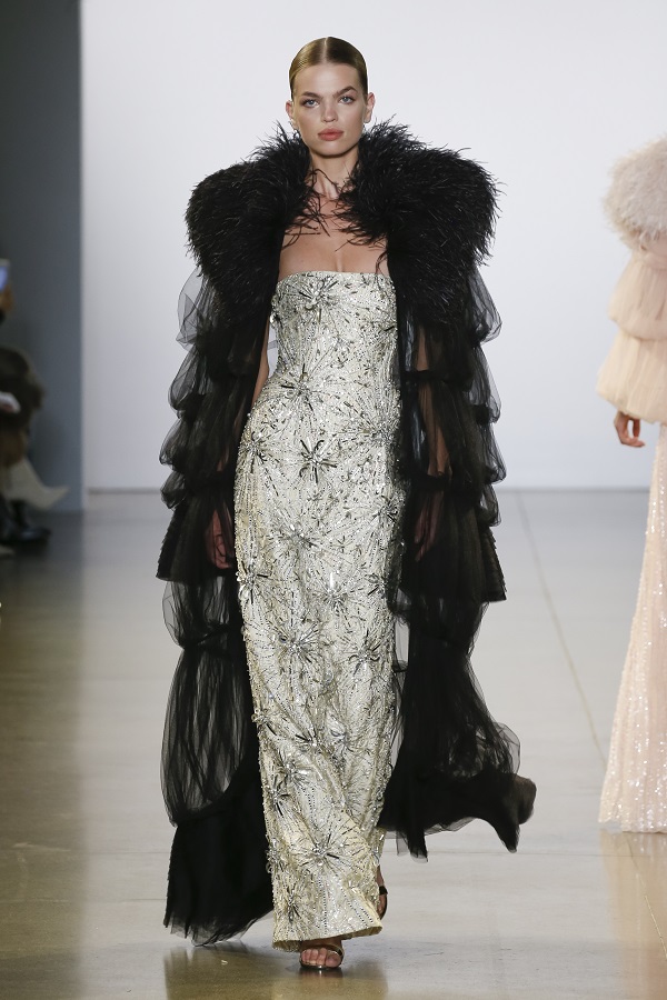 Giới mộ điệu thật thích thú bởi sự kết hợp đầy mới lạ của những chiếc áo khoác bằng tơ lưới xuyên thấu màu hồng, xám và đen mặc bên ngoài những chiếc đầm dạ hội cùng chất liệu được đính đan xen đá pha lê và lông vũ cùng màu.