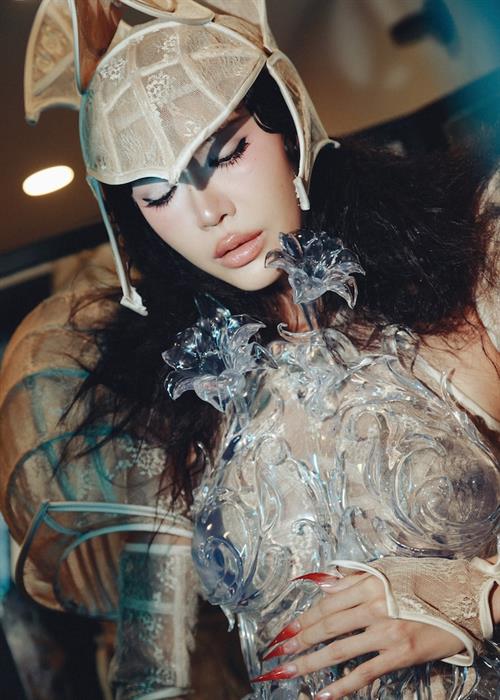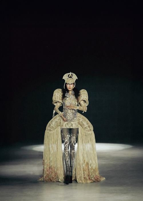 Minh Tú xuất hiện trong phần mở màn trong bộ trang phục được thiết kế khá độc đáo trong bộ sưu tập “No Season 2026: 245KM” của NTK trẻ Quách Đắc Thắng. Bộ trang phục là sự hòa quyện tinh tế giữa chất liệu voan màu beige nhẹ nhàng và những chi tiết tạo khối mang đậm tính điêu khắc. Nổi bật nhất là phần thiết kế 3D bằng nhựa tỉ mỉ, ôm trọn từ ngực đến bụng người mẫu, tạo nên một tổng thể đầy nghệ thuật.