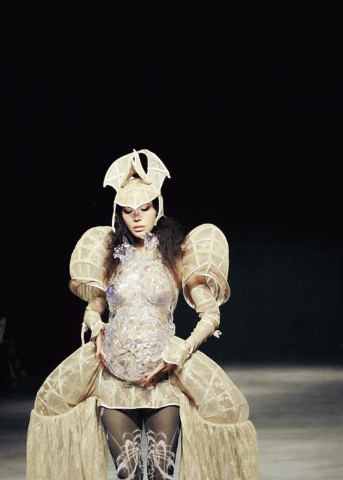 Minh Tú thu hút sự tập trung của khán giả với động tác trình diễn đặc biệt, nâng niu phần bụng được thiết kế nhô nhẹ đầy ẩn ý, gợi liên tưởng đến hình ảnh thiêng liêng của một người mẹ đang mang thai. Bên cạnh đó, cô còn khéo léo kết hợp những sải bước nhẹ nhàng nhưng vững chắc trên đôi giày hình khối cao 18cm khiến dàn khách mời tham dự không thể rời mắt.