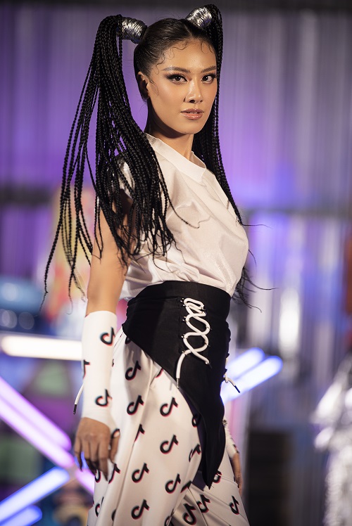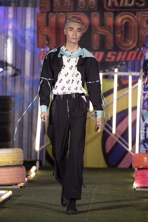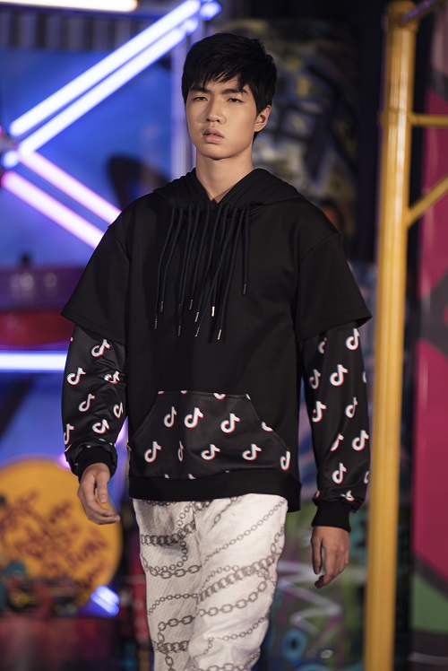 Một điều thú vị nữa trong “I-Gene” chính là cách xử lý in ấn hoạ tiết. Ivan Trần đã khéo léo lồng ghép logo TikTok theo xu hướng logomania hoặc dây xích trải dài mà không hề mang lại cảm giác khiên cưỡng khó chịu. Hình ảnh logo TikTok khơi gợi những cảm hứng mới trong thiết kế thời trang ở thời đại công nghệ 4.0, kỉ nguyên của kỹ thuật số, nền tảng livestream trực tuyến… tất cả cực kỳ phù hợp với tinh thần tự do nơi “I-Gene” mà Ivan Trần muốn truyền tải.