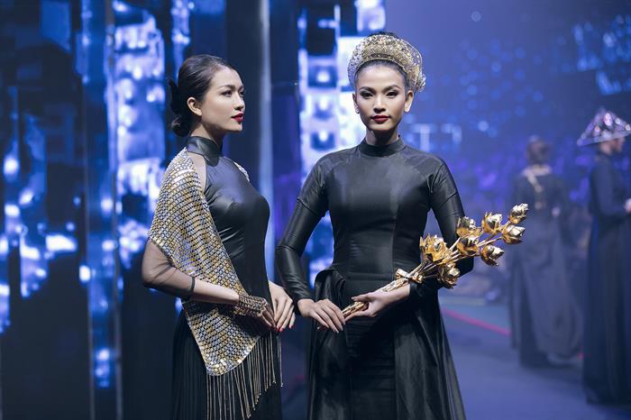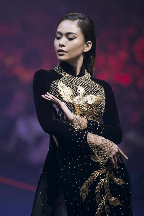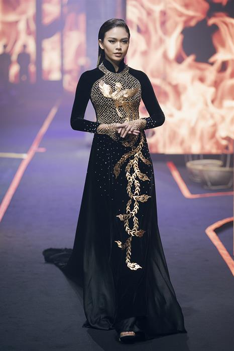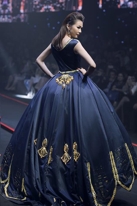 Tiêu biểu trong số đó chính là bộ nữ trang mô phỏng lại hình ảnh hồ Gươm với Tháp Rùa cổ kính, được thiết kế tỉ mỉ, tinh tế đến từng gợn sóng, đưa người xem về với mảnh đất kinh kỳ ngàn năm văn hiến. Đến miền Trung nắng gió, hình ảnh chùa Thiên Mụ hay lăng vua Khải Định tiếp tục được tái hiện sinh động, cầu kỳ và đầy sáng tạo qua những sợi tơ vàng và lá vàng siêu mỏng.