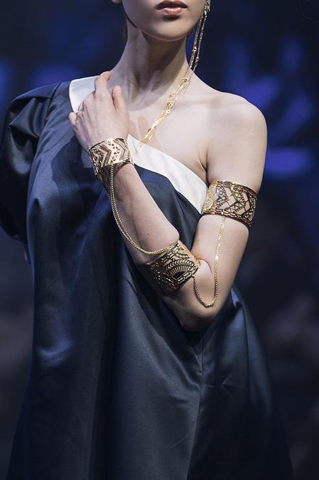 Điểm dừng chân đầu tiên, đưa người xem chìm vào bầu không khí hoài cổ đến từ bộ sưu tập có chủ đề Origin. Phủ lên cảm thức của người xem lúc này chính là vẻ đẹp của sông núi và con người Việt Nam. Cuộc hành trình xuyên suốt chiều dài đất nước, đi từ Bắc chí Nam, qua những ruộng bậc thang miền trung du phía Bắc, đến đồi cát miền Trung để rồi cuối cùng dừng chân tại cảnh sông nước yên bình của miền Nam. Vẻ đẹp ấy còn được tái hiện qua đôi tay tài hoa của các nghệ nhân trong loạt trang sức vàng. Trên nền lụa Lãnh Mỹ A đen nhánh, những thiết kế tinh xảo bằng vàng khối nguyên chất càng trở nên nổi bật, phát ánh vàng rực rỡ. Được biết, hàng trăm nghệ nhân được huy động để thổi hồn vào hàng loạt hình ảnh mang đậm hồn sắc Việt. Vàng, với đặc tính linh hoạt đặc trưng, đã chuyển tiếp ánh hào quang rực rỡ vào từng chiếc nón lá tinh khôi, mấn đội đầu cao quý, khăn choàng áo kiêu sa, hay thậm chí là cả bó hoa sen trên tay người thiếu nữ. Và với bộ sưu tập Origin, một lần nữa, vàng hoá thân duyên dáng qua từng thiết kế để tôn vinh con người và hình hài đất Việt, cũng như một lần nữa tôn vinh những giá trị truyền thống của thương hiệu PNJ.