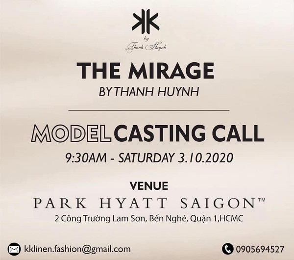 Tintuc - Ngày 3/10, Nhà thiết kế Thanh Huỳnh sẽ có buổi tuyển chọn người mẫu quy mô lớn để phục vụ cho show diễn riêng mang tên “The Mirage”. Ngồi vị trí giám khảo casting còn có siêu mẫu Minh Tú, Á hậu Kiều Ngân. Được biết, đây là số diễn đặc biệt với mục đích quyên góp ủng hộ từ thiện từ Nhà thiết kế tâm huyết.
