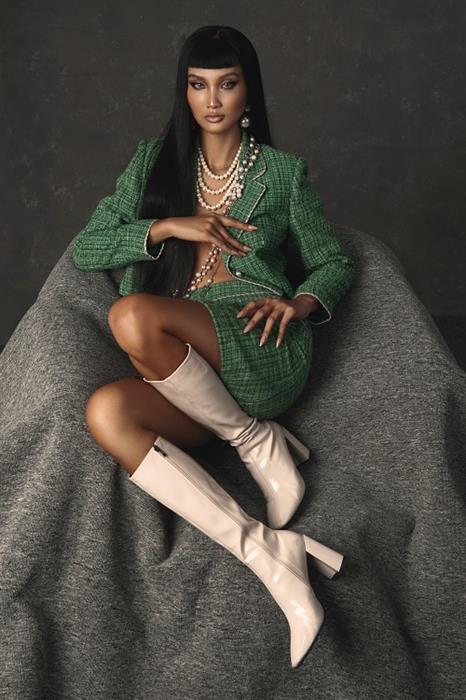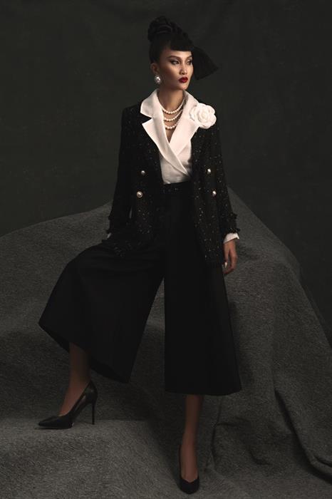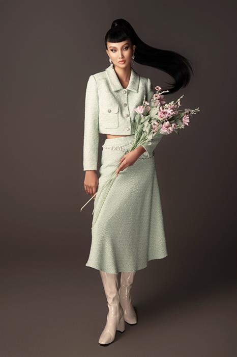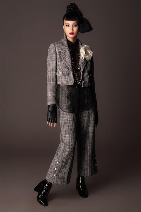 Trong loạt ảnh mới, Bùi Tường Vân diện những thiết kế nằm trong BST mới nhất của thương hiệu SIXDO. Các thiết kế đều được thực hiện trên nền vải tweed, hợp xu hướng trong mùa thời trang Thu – Đông. NTK Đỗ Mạnh Cường đặt dệt riêng, với tỉ lệ sợi phù hợp với vùng nhiệt đới.