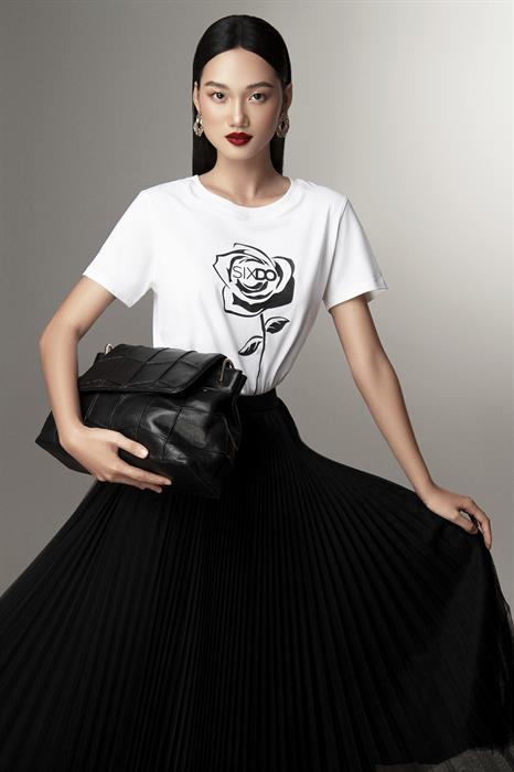 Áo phông hoạ tiết hoa hồng là điểm nhấn từ thương hiệu mới của NTK Đỗ Mạnh Cường. Chiếc áo thiết kế tối giản đi kèm chân váy xếp li, phối thêm túi, giày cao, hoa tai ánh kim đủ giúp phái đẹp khởi đầu một ngày mới đầy năng lượng bởi vẻ ngoài quá đỗi cuốn hút.