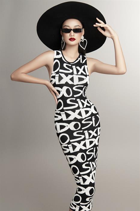 Đầm ôm không tay với hoạ tiết SIXDO, điểm nhận dạng thương hiệu giúp các cô nàng khoe đường cong hoàn hảo. Hoa tai to bản với thiết kế trái tim lạ mắt, kính đen, mũ rộng vành cùng màu môi đỏ tạo nên tổng thể hoàn hảo, vừa trẻ trung, nhưng không kém phần quyến rũ.