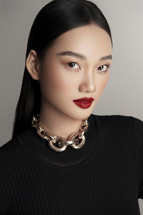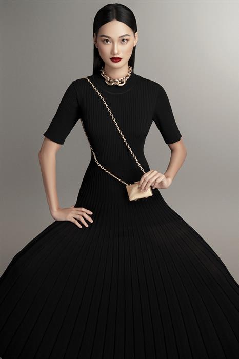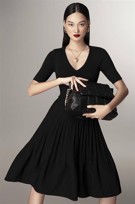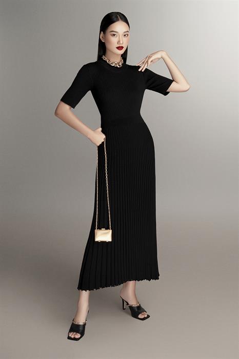 Những đường xếp nếp tạo điểm nhấn cho chiếc váy tay lửng, cổ tròn, độ dài quá gối. Phụ kiện màu vàng ánh kim tạo thêm điểm sáng cho trang phục. Với trang phục màu đen, sắc môi đỏ được ưa chuộng để tăng thêm sự cuốn hút.