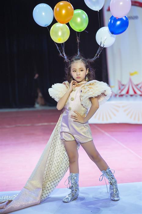 Mẫu nhí Võ Ngọc Trâm Anh mở màn với mái tóc gắn những chiếc bóng bay màu sắc lạ mắt, tạo sự hứng thú cho người xem.