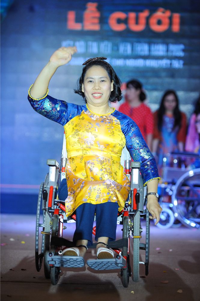 Tại đám cưới của những người khuyết tật, NTK Việt Hùng hạnh phúc đứng giữa các người mẫu mặc áo dài lộng lẫy ngồi trên những chiếc xe lăn, bám vào những đôi nạng gỗ.