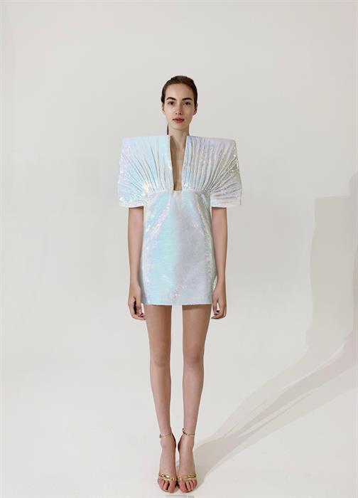 Có thể thấy những ý niệm về thời trang của Nguyễn Công Trí, bao gồm sự thanh lịch – cân bằng – khéo léo đều được thu trọn trong sáng tạo này. Dẫu là một thiết kế sự kiện, nhưng không đi vào tiểu tiết đính kết rườm rà hay đầm dài thướt tha, người anh cả của làng mốt Việt tập trung khai khác sự tinh giản trong phom dáng cùng những đường cắt may sắc sảo, thể hiện kĩ nghệ tinh tuyền của những người thợ thủ công lành nghề. Từ những ngày đầu tiên, nhà thiết kế đã tâm niệm về việc tạo ra một chiếc mini dress nhằm khoe trọn đôi chân thon dài của siêu mẫu kì cựu. Trên nền chất liệu vải ánh kim bắt mắt, nhà thiết kế khéo léo khoét sâu phần cổ áo để thể hiện sự bí ẩn gợi cảm của siêu mẫu người Đức, đồng thời xử lí phần ngực bằng kĩ thuật xếp pli nhằm tạo điểm nhấn thu hút thị giác.