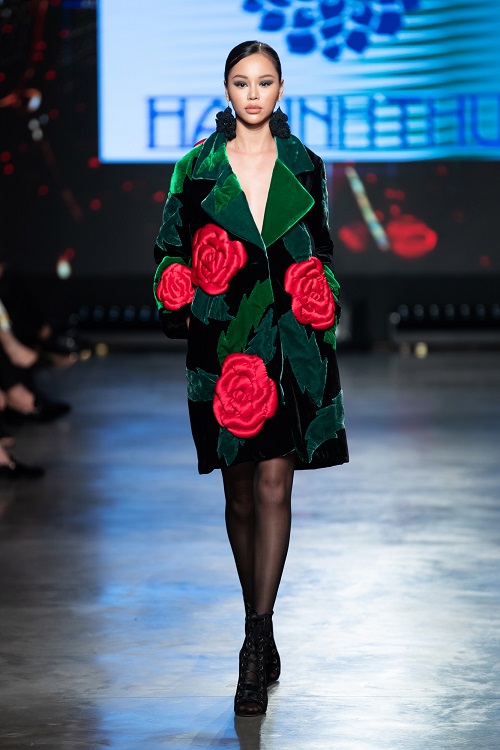 NTK Hà Linh Thư sử dụng màu hồng để đi cùng với màu đen chủ đạo cho phần đầu thay cho màu đỏ, cho thấy dụng ý của cô về nét đẹp tươi tắn của người phụ nữ những năm tháng thanh xuân.