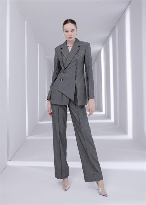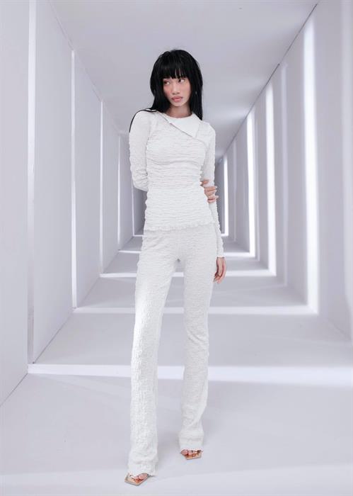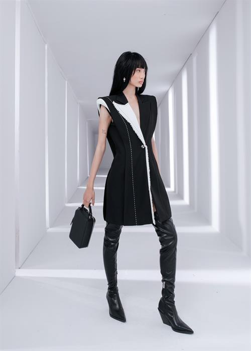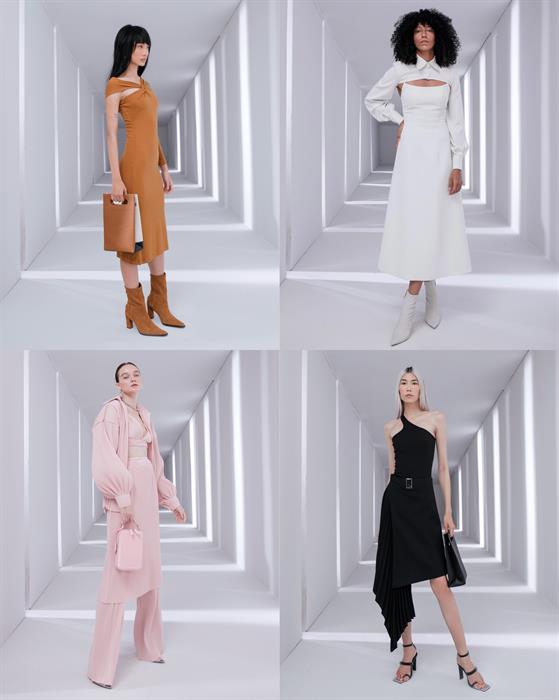 BST đầu tiên mang tinh thần tối giản với các gam màu trung tính như đen, trắng, xám, nâu. Điểm nhấn nổi bật của bộ sưu tập là set váy hồng phối cùng sơ mi tay bồng dập ly, đây là phong cách được dự đoán sẽ là xu hướng thời trang trong năm 2021.