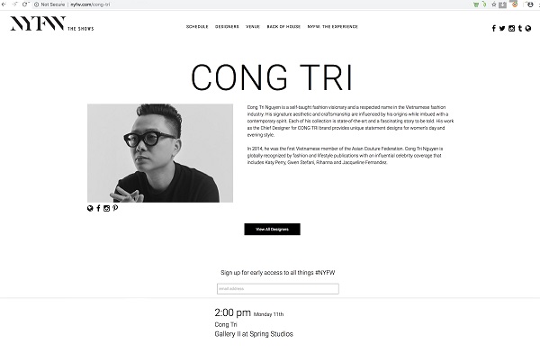 Show diễn của NTK Công Trí sẽ diễn ra vào lúc 2h chiều ngày 11/2 giờ của Mỹ tại Vanue Spring studios II, rơi vào lúc 2h rạng sáng ngày 12/2 của giờ Việt Nam.