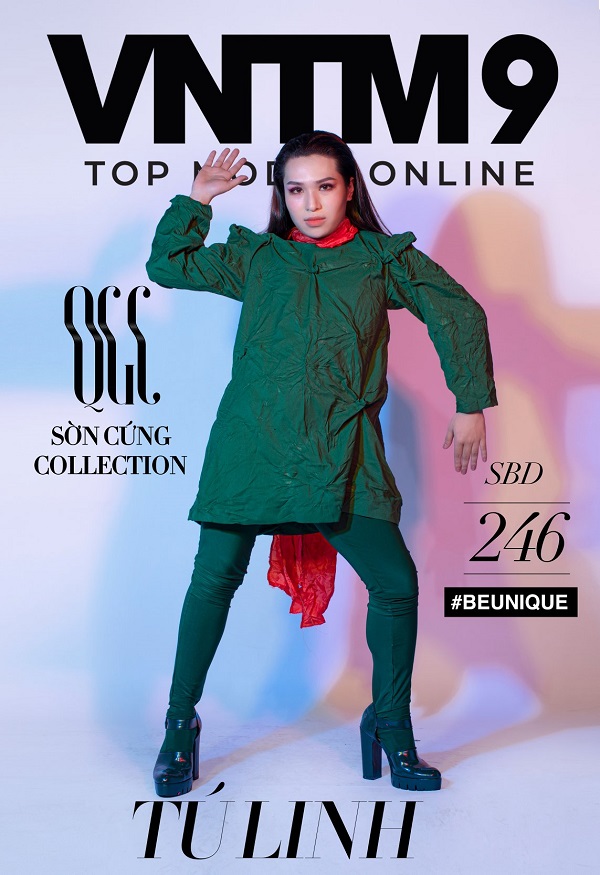 Không có lợi thế chiều cao, Tú Linh lựa chọn phương án tạo dáng đơn giản, tập trung vào những cử động thể hiện sự thô ráp, cứng nhắc và cũ kĩ của trang phục.