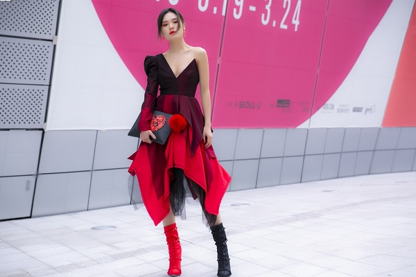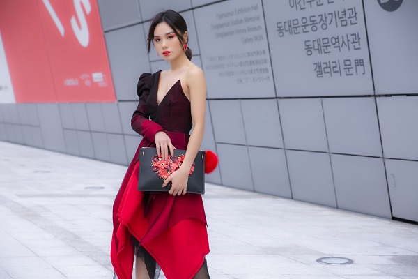 Trái ngước với sự mạnh mẽ, cá tính của Quỳnh Anh, Trâm Anh chọn phong cách nữ tính, ấn tượng. Không ngại thời tiết lạnh, cô diện thiết kế bất đối xứng ở phần trên, khoe khéo bờ vai và nước da nõn nà. Trâm Anh tinh tế phối boot đỏ – đen đồng nhất với trang phục, tạo được điểm nhấn. Cách trang điểm sắc sảo, cuốn hút biến Trâm Anh thành đóa hồng bừng nở giữa trời Hàn giá lạnh.