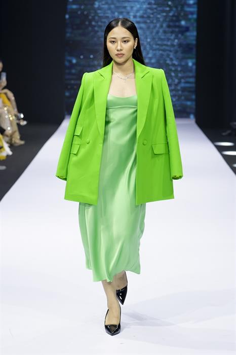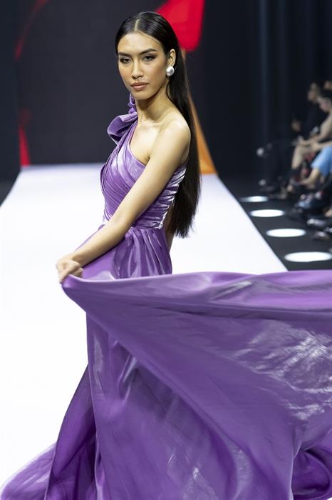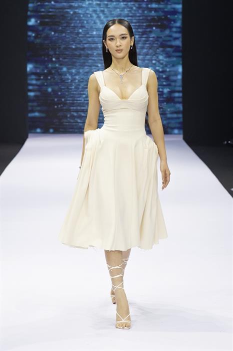 Khép lại chương trình là BST Bellaza. Đánh dấu sự chuyển mình mạnh mẽ của thương hiệu Thái Tuấn – đã nổi tiếng từ lâu về trang phục áo dài, BST Bellaza của Thái Tuấn và NTK Hoàng Hải đã mang đến một diện mạo mới về chất liệu cho thời trang Việt Nam. BST tập trung sử dụng 2 loại chất liệu chính là chất liệu làm từ sợi tái chế, một chất liệu thời trang của tương lai và thế giới, trong xu hướng chung cùng hướng đến một môi trường xanh và sạch hơn. Loại chất liệu thứ 2 là sợi tơ tằm 100% tự nhiên. Thông qua BST này, đêm diễn chia sẻ muốn lan tỏa thông điệp về thời trang bền vững, gần gũi với thiên nhiên. Thêm vào những đường cut out tinh tế, nhấn nhá xếp nếp sở trường của NTK Hoàng Hải đã tạo nên một phần trình diễn hoàn hảo.