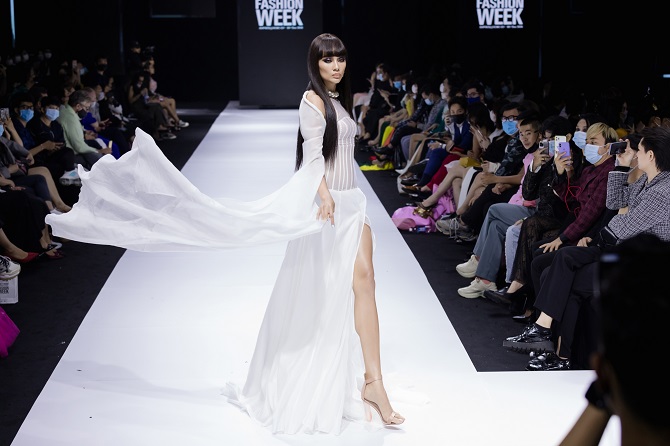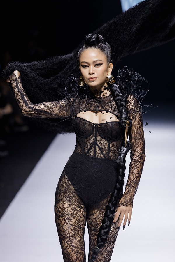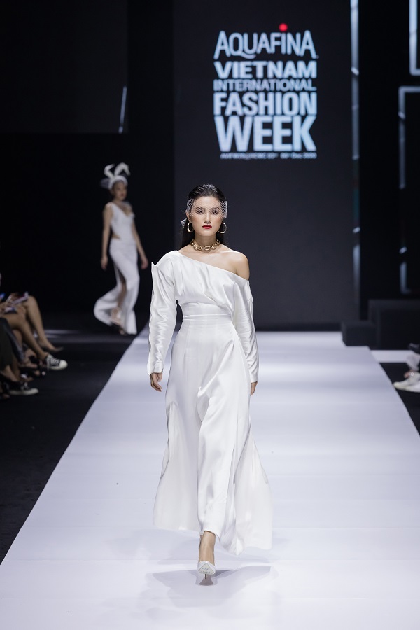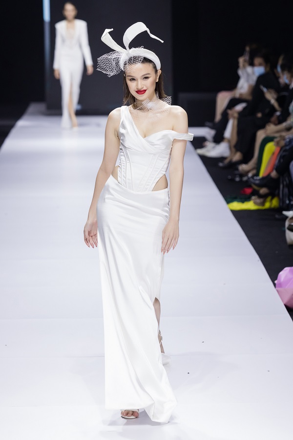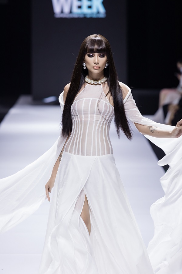 Phần ở màn của siêu mẫu Võ Hoàng Yến khi khoác trên mình thiết kế của NTK LONG NG nằm trong BST “Em ơi” đã khiến phía dưới khán đài hú hét không ngớt. Võ Hoàng Yến như hóa thân thành “thiên thần sa ngã” trong bộ đầm trắng tinh khiết với thiết kế mới lạ nhưng lại toát lên vẻ đẹp vừa mong manh, vừa sang trọng của người phụ nữ. Với thần thái đỉnh cao cùng những bước đi nhịp nhàng, uyển chuyển và đầy nội lực trên sàn runway, nữ siêu mẫu như một thỏi nam châm thu hút hết toàn bộ ánh nhìn của khán giả.