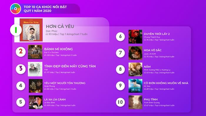 Thống lĩnh top 2 đầu bảng là hai bản hit mang màu sắc trong trẻo, vui tươi: Hơn cả yêu của Đức Phúc (top 1) và Bánh mì không từ Đạt G, DuUyen. Trong đó, ca khúc truyền tải thông điệp nhân văn về tình yêu của Đức Phúc gặt hái thành tích nổi trội nhất quý I: đứng đầu #zingchart suốt 7 tuần, 93 triệu lượt nghe trên Zing MP3. Bài hát dễ thương của Đạt G và DuUyen đứng đầu #zingchart 3 tuần và đạt 128 triệu lượt nghe.