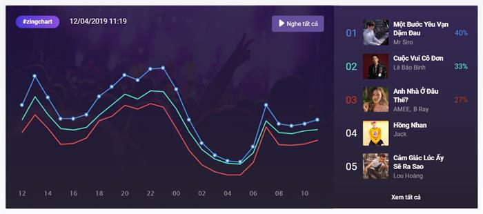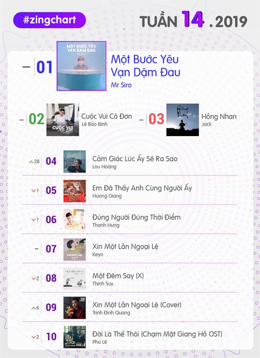 Top 10 #zingchart tuần này không có nhiều thay đổi, ngoại trừ sự thăng hạng của Cảm giác lúc ấy sẽ ra sao (Lou Hoàng). Ca khúc tăng vọt 28 bậc và “hạ cánh” tại hạng 4 tuần này. Một bước yêu vạn dặm đau tiếp tục dẫn đầu #zingchart tuần. Đây là tuần thứ ba liên tiếp Mr Siro giữ vững ngôi vương trên BXH.