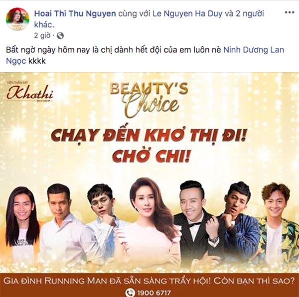 Bất ngờ của chưa dừng lại ở đó, tối 26/07, hoa hậu Thu Hoài đăng tải lên trang cá nhân hình ảnh xác nhận dàn sao nam của “Running Man Vietnam – Chạy đi chờ chi” gồm: Trấn Thành, Ngô Kiến Huy, Trương Thế Vinh, Jun Phạm, BB Trần, Liên Bỉnh Phát sẽ cùng hội ngộ và đổ bộ vào “Beauty’s Choice” sắp tới. Được biết, đây là lần hiếm hoi đông đủ các nghệ sĩ nam của “Running Man Vietnam – Chạy đi chờ chi” gặp lại nhau và cùng ủng hộ chương trình hoành tráng của hoa hậu Thu Hoài.