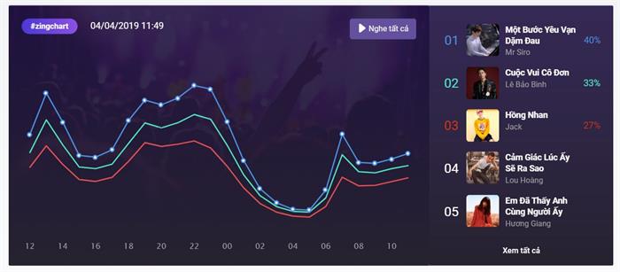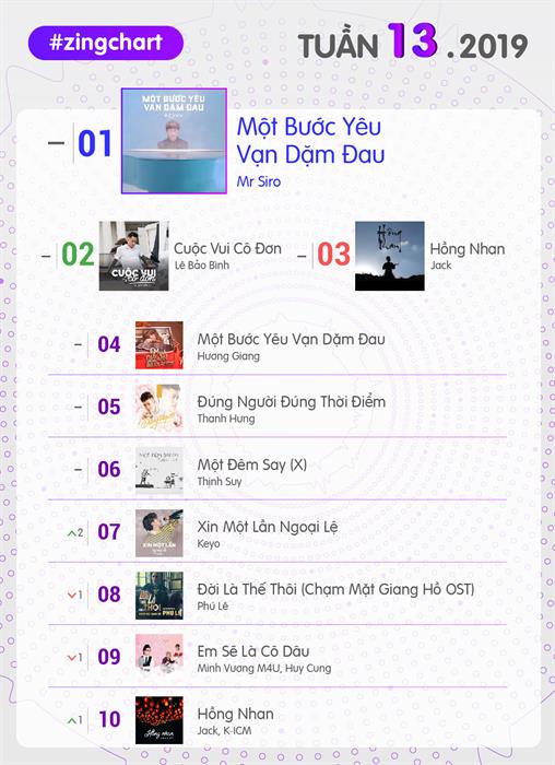 Một bước yêu vạn dặm đau của Mr Siro có tuần thứ 2 thống lĩnh BXH nhạc Việt. Phiên bản remix của Hồng nhan thực hiện bởi K-ICM chốt hạ top 10 #zingchart tuần này. Jack trở thành nghệ sĩ thứ hai, sau Will (365), sở hữu ca khúc có 2 phiên bản cùng có mặt trong top 10 nhạc Việt. Trước đó, Tận cùng nỗi nhớ của Will từng lập được thành tích này.