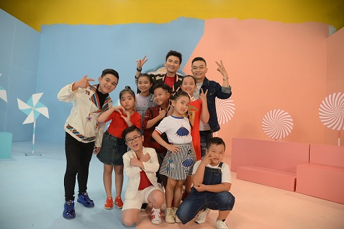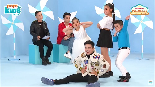 Ca sĩ, biên đạo Kỳ Phương (áo jean) cùng ca sĩ Chí Thiện hướng dẫn các bé trong vòng thi cuối