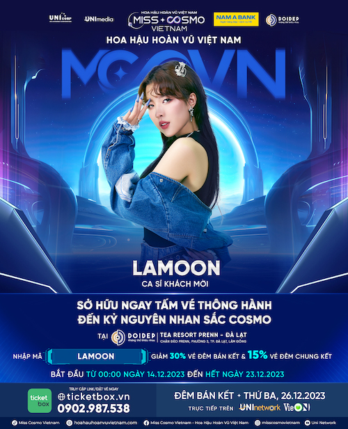 Là một trong những nghệ sĩ Gen Z nổi bật, bước ra từ Vietnam Idol 2023, “tân binh” Lamoon gây ấn tượng với khán giả bằng giọng hát dễ thương, ngọt ngào cùng ngoại hình xinh xắn. Nữ ca sĩ như một “tắc kè hoa” khiến khán giả liên tục bất ngờ khi thay đổi phong cách âm nhạc đa dạng nhưng vẫn là một Lamoon cực trendy và thời thượng trong mắt người yêu âm nhạc. Dù mới debut chính thức trên thị trường Việt Nam nhưng cái tên Lamoon đã nhận được sự chú ý đặc biệt từ khán giả. Tính nữ và sự phù hợp trong các ca khúc của Lamoon hứa hẹn sẽ mang đến những phần trình diễn đặc sắc khi đồng hành cùng Top 40 Hoa hậu Hoàn vũ Việt Nam – Miss Cosmo Vietnam 2023.