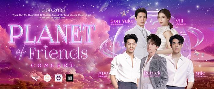 Ngày 10/9, "Planet of Friends Concert" với sự góp mặt của 5 gương mặt đình đám làng giải trí Thái Lan: Patrick Nattawat Finkler, Son Yuke Songpaisan, Vill Wannarot Sonthichai, Mile Phakphum Romsaithong, và Apo Nattawin Wattanagitiphat sẽ diễn ra tại Trung tâm thể dục thể thao Uỷ ban Nhân Dân Thành Phố Thủ Đức, Tp.HCM. Đây không chỉ là một sự kiện âm nhạc độc quyền mà còn là một dịp để mang những ngôi sao quốc tế gần hơn với người hâm mộ Việt Nam.