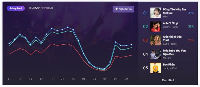 Bên cạnh đó, Vpop tuần qua cũng chứng kiến cuộc đối đầu giữa hai giọng ca nữ - Min và Chi Pu. Rũ bỏ hình tượng “cô nàng cá tính” với các bản EDM, Chi Pu chuyển hướng sang ballad ở lần trở lại này với Anh ơi ở lại. Ca khúc ra mắt tại hạng 5 #zingchart tuần này. Trên “địa hạt” #zingchart real-time, sản phẩm của Chi Pu đang bám sát nút quán quân Đừng yêu nữa, em mệt rồi ở vị trí thứ 2.