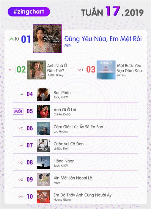 Tintuc - Min đã có một màn tái xuất Vpop thành công với Đừng yêu nữa, em mệt rồi. Ngoài ra, Chi Pu lần đầu có bản hit “công phá” bảng xếp hạng nhạc Việt sau 2 năm đi hát.