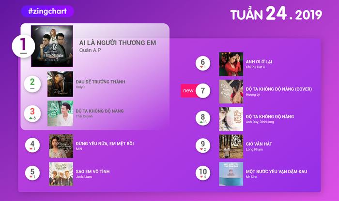 Với loạt thành tích chấn động, Độ ta không độ nàng trở thành một trong những hiện tượng nổi bật nhất trong lịch sử nhạc Việt. Điểm lại top 10 #zingchart tuần này, ngôi vương tiếp tục gọi tên Ai là người thương em. Áp sát tại vị trí á quân là Đau để trưởng thành. Quân A.P và OnlyC giữ vững top 2 đầu bảng, chặn đứng “cơn bão” Độ ta không độ nàng.