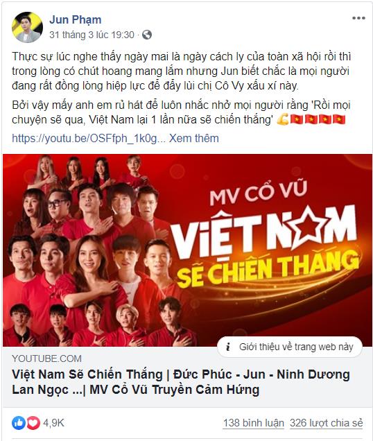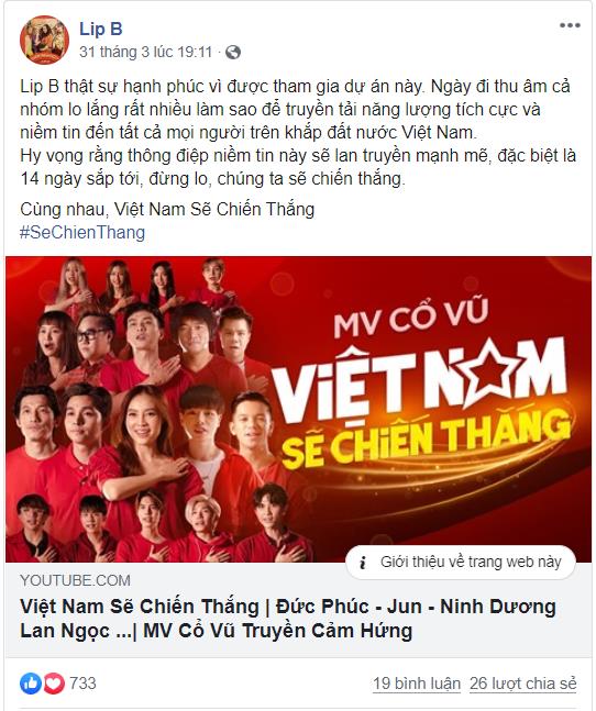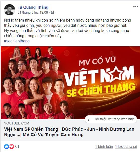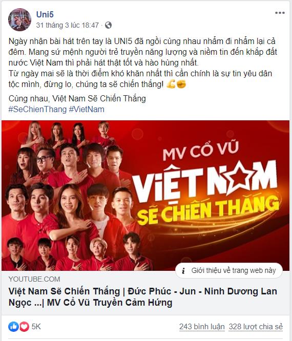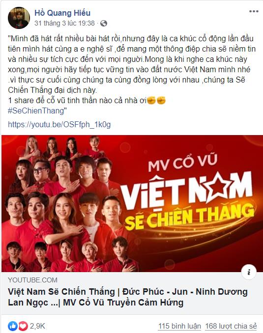 MV Việt Nam Sẽ Chiến Thắng ra mắt ngày 31.3, lấy cảm hứng từ thông điệp “Cùng nhau, chúng ta sẽ chiến thắng”. MV nhận được sự quan tâm và hưởng ứng tích cực từ khán giả trên khắp cả nước. Ở thời điểm nước ta đang bước vào giai đoạn căng thẳng của cuộc chiến chống dịch Covid-19, dân tộc Việt Nam cần đoàn kết và giữ vững tinh thần lạc quan. MV Việt Nam Sẽ Chiến Thắng là một lời kêu gọi toàn dân cùng chung tay, tiếp sức để đẩy lùi dịch bệnh.