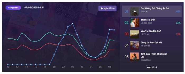 Top 5 #zingchart đang được chiếm đóng bởi các giọng ca nam. Thích thì đến (Lê Bảo Bình), Yêu từ đâu mà ra (Lil Zpoet), Đừng lo anh đợi mà (Mr Siro), Tình sầu thiên thu muôn lối (Doãn Hiếu) đang bám sát ngôi vương của Em không sai chúng ta sai (Erik).