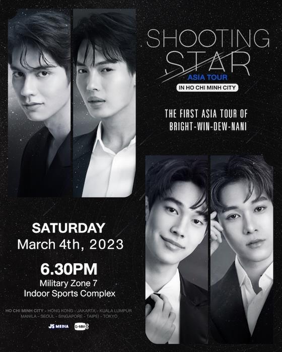 “Shooting Star Asia Tour” sẽ chính thức có mặt tại Việt Nam với sự kiện “Shooting Star in Ho Chi Minh city” diễn ra vào 18h30 ngày 04.03.2023 tại Nhà thi đấu Quân khu 7 (202 Hoàng Văn Thụ, Phường 9, Quận Phú Nhuận, Thành phố Hồ Chí Minh) do JS Media cùng GMMTV (Thái Lan) tổ chức.