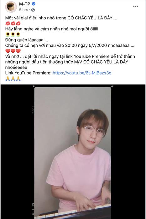 Tintuc - Tối 3/7, Sơn Tùng M-TP khiến người hâm mộ “đứng ngồi không yên” khi đăng tải clip tự đệm đàn piano hát trước một đoạn giai điệu ca khúc “Có Chắc Yêu Là Đây” sắp lên sóng lúc 20h ngày 5/7 tới.