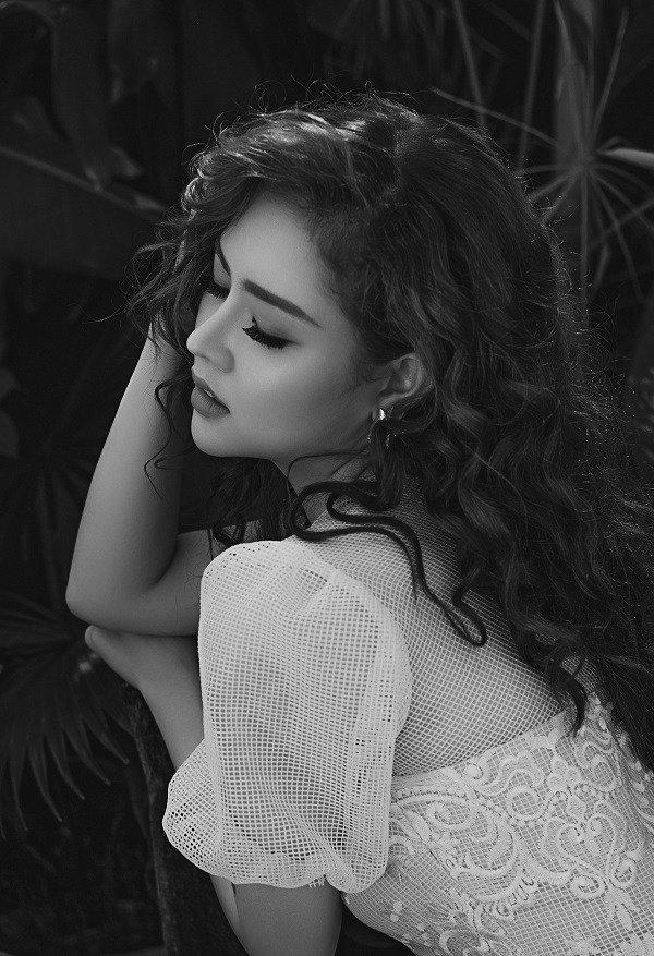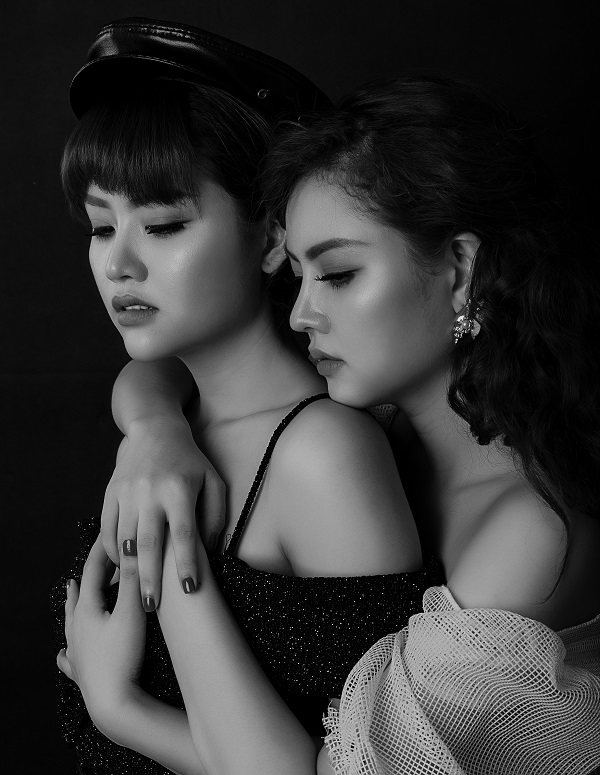 Nếu bộ hình đen trắng tập trung đi vào biểu cảm gương mặt với nét buồn thoảng qua thì bộ hình màu thắt bím như thể hiện tình cảm của những cô nàng đang giai đoạn mới yêu. Nét đẹp mềm mại, tươi xinh và trong trẻo được phác họa qua cách chọn layout trang điểm tông hồng đào, tóc thắt bím. Trang phục màu nude càng gợi nên vẻ đẹp tinh khôi cho Bảo Anh – Bảo Trân.