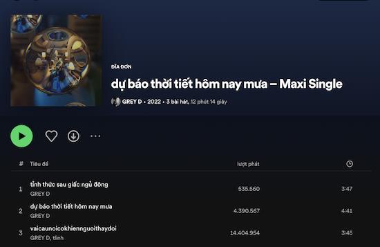 Đây là thành tích đáng ghi nhận đối với một nghệ sĩ mới như GREY D, bởi nam ca sĩ chỉ vừa debut trong năm 2022 và sở hữu 3 sản phẩm âm nhạc chính thức: ‘vaicaunoicokhiennguoithaydoi’ (14 triệu lượt nghe), ‘dự báo thời tiết hôm nay mưa’ (4,3 triệu lượt nghe), ‘tỉnh thức sau giấc ngủ đông’.