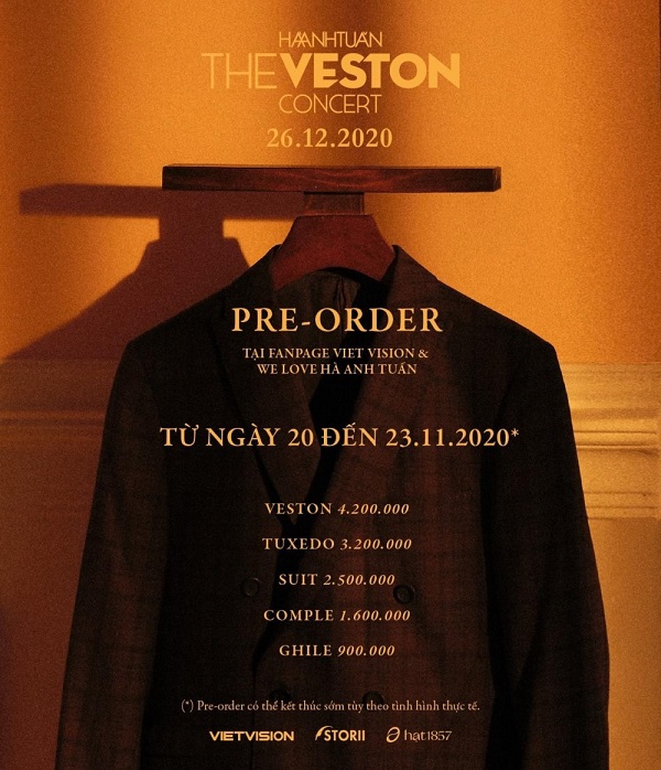 Năm nay vé sẽ được phân phối qua website http://storii.vn với 5 loại vé khác nhau: Ghile (900.000 VND/vé), Comple (1.600.000 VND/vé), Suit: (2.500.000/vé), Tuxedo (3.200.000 VND/vé) và cuối cùng là Veston (4.200.000 VND/vé). Với mỗi hộp vé live concert “The Veston”, khán giả sẽ được tặng kèm được một ví da bỏ túi để đựng các loại thẻ bên trong với 5 màu khác nhau tương đương với 5 loại vé và Hà Anh Tuấn còn cẩn thận chuẩn bị một khẩu trang và nước rửa tay trong mỗi vé để giữ an toàn sức khỏe cho khán giả khi tham gia đêm nhạc.