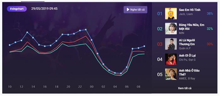Tintuc - Thừa thắng xông lên sau chuỗi hit “Hồng nhan - Bạc phận”, Jack nhanh chóng vượt mặt Min và Chi Pu để giành vị trí dẫn đầu BXH nhạc Việt với tác phẩm mới nhất “Sao em vô tình”.