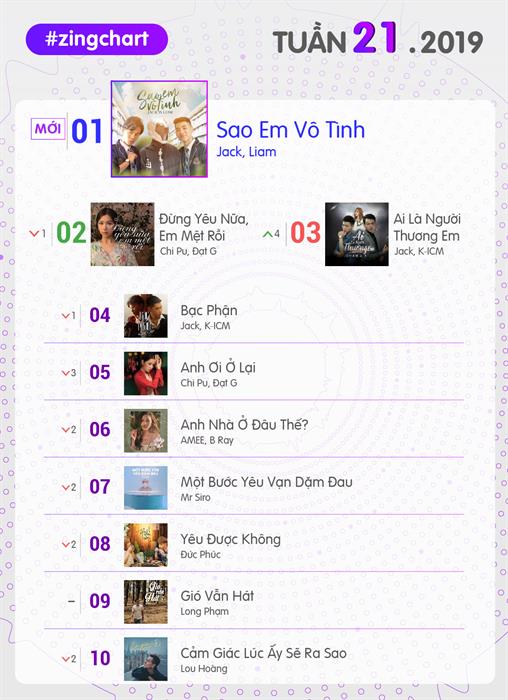 Tuy nhiên, mới đây, Min đành phải nhường lại ngôi bá chủ #zingchart cho Jack - chủ nhân ca khúc Hồng nhan. Sau khi công phá Vpop với chuỗi liên hoàn hit Hồng nhan và Bạc phận, Jack tiếp tục trình làng sản phẩm mới mang tên Sao em vô tình. Giọng ca không chuyên bắt tay cùng producer người Hà Lan gốc Việt - Liam.