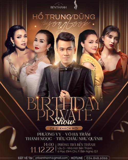 Sắp tới đây, vào dịp sinh nhật 40 của mình, ca sĩ Hồ Trung Dũng quyết định tổ chức một buổi tiệc âm nhạc riêng tư mang tên “The Songbook” để dành thời gian cho gia đình, bạn bè và những người thân yêu. Góp mặt trong buổi tiệc còn có sự xuất hiện của Phương Vy, Võ Hạ Trâm, Thanh Ngọc, Tiêu Châu Như Quỳnh. Ngoài ra, nam ca sĩ tâm sự rằng cố tình tổ chức vào buổi chiều vì hy vọng chương trình sẽ như một buổi trà chiều để khán giả, bạn bè vừa có thể nghe nhạc, vừa có thể “tám chuyện” với nhau để tạo nên những ký ức đẹp. Đối với anh, anh không quá bận tâm về số lượng vé được bán tại buổi nhạc đó mà chỉ cần sự có mặt của những khán giả thật sự có theo dõi và yêu thích mình.